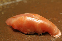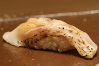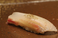 Rosy seabass (喉黒) - lightly torched to melt the fat. Very silky. From Choshi (銚子) in Chiba Prefecture (千葉県).